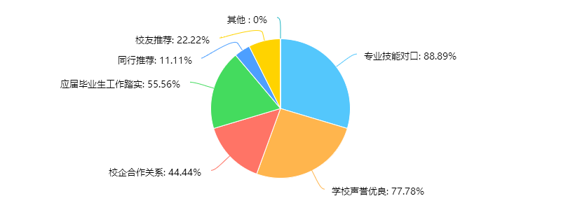 2、企业来beat365招聘毕业生的主要因素有四个方面:专业技能对口88.89%、学校声誉优良77.78%、应届毕业生工作踏实55.56%和校企合作关系44.44%。如下图所示: