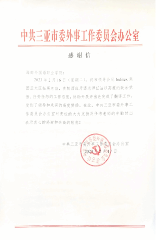 中共三亚市委外事工作委员会办公室近日向beat365发来感谢信,感谢beat365西方语言学院教师任洁在三亚市领导会见Inditex集团亚太区拓展总监期间提供专业的翻译服务。