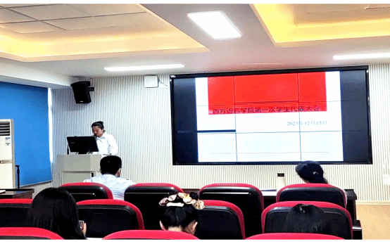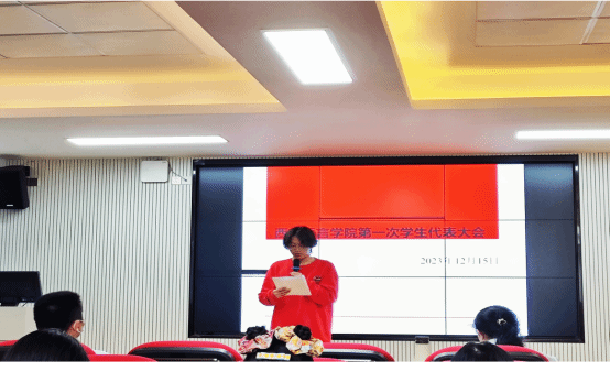 西方语言学院第一次学生代表大会于2023年12月15日在多媒体8教室隆重举行。学院党总支副书记顾大育、学院团总支负责人史丹娆老师、25名正式学生代表以及8名列席代表参加了会议。西方语言学院学生会执行主席盛镜瑜同学主持会议。