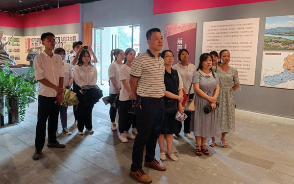 全体师生党员在“讲解员”谢雨欣同志的带领下进行椰子寨战斗历史陈列馆参观学习。