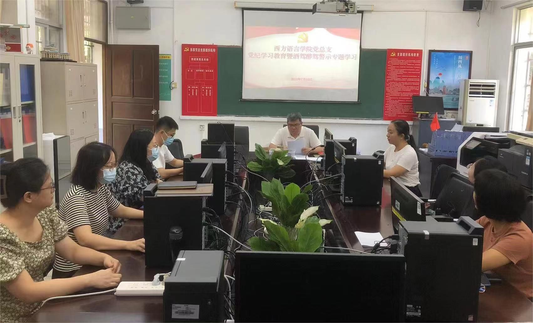 7月10日上午,西方语言学院党总支在学院会议室召开党纪学习教育暨酒驾醉驾警示专题学习会。西方语言学院全体党员教师参加会议,党总支副书记符振忠同志主持会议。