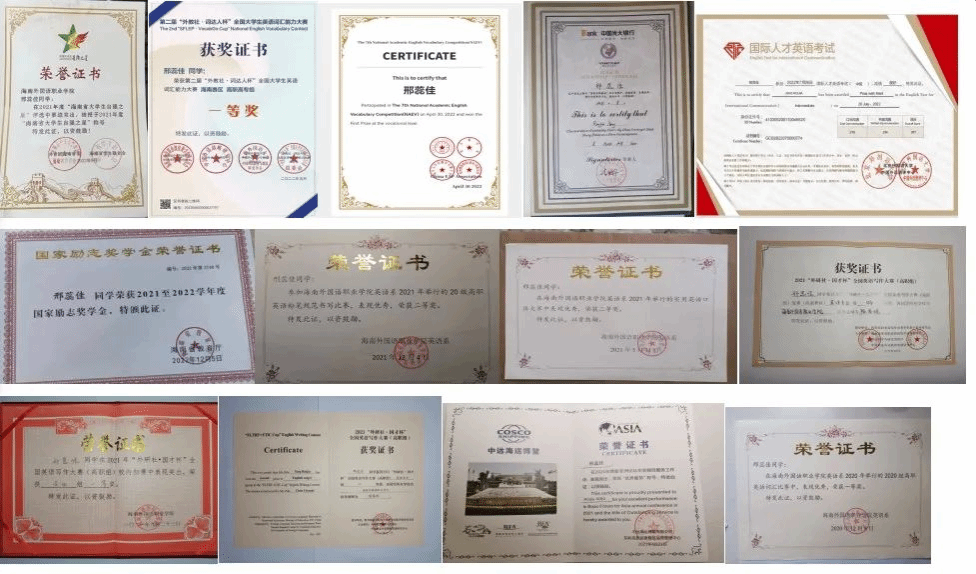在校期间她曾获2021-2022年国家本(专)科生励志奖学金;2021年“外研社·国才杯”全国英语写作大赛(高职组)英语专业组二等奖;第七届全国学术英语词汇竞赛高职高专组全国一等奖;2021年度海南省“大学生自强之星”荣誉称号;2021“外研社·国才杯”全国英语写作大赛(高职组)复赛(海南赛区)英语专业组特等奖;第二届“外教社·词达人杯”全国大学生英语词汇能力大赛海南赛区高职高专组一等奖;2022年beat365英国官方网站“五四优秀共青团员”称号;获得国家级奖项3项,省级奖项6项,院部及系部奖项30余项。