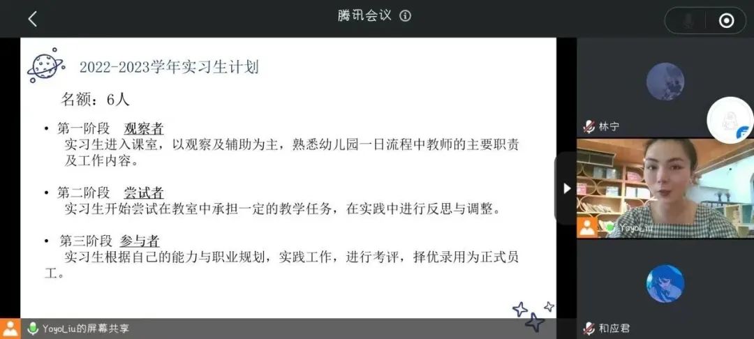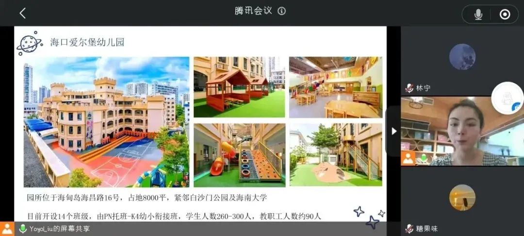 缔造未来•爱尔堡双语幼儿园位于海口市美兰区海甸岛,城堡式的园所环境,优美舒适,给孩子童话般的遐想空间。园所占地12亩,总建筑面积8000余平方米。刘瑶园长在云端宣讲会中表示:“作为本专业幼儿文学、幼儿英语教学法课程外聘教师,我与同学们相处已经有一个学期。海外院学前教育专业的同学们基础扎实、综合素质优秀,在我们团队一直有着很高的认可度。非常感谢学校为企业和毕业生搭建供需对接的平台,希望借此机会能够招收更多优秀的海外院学子加入。”