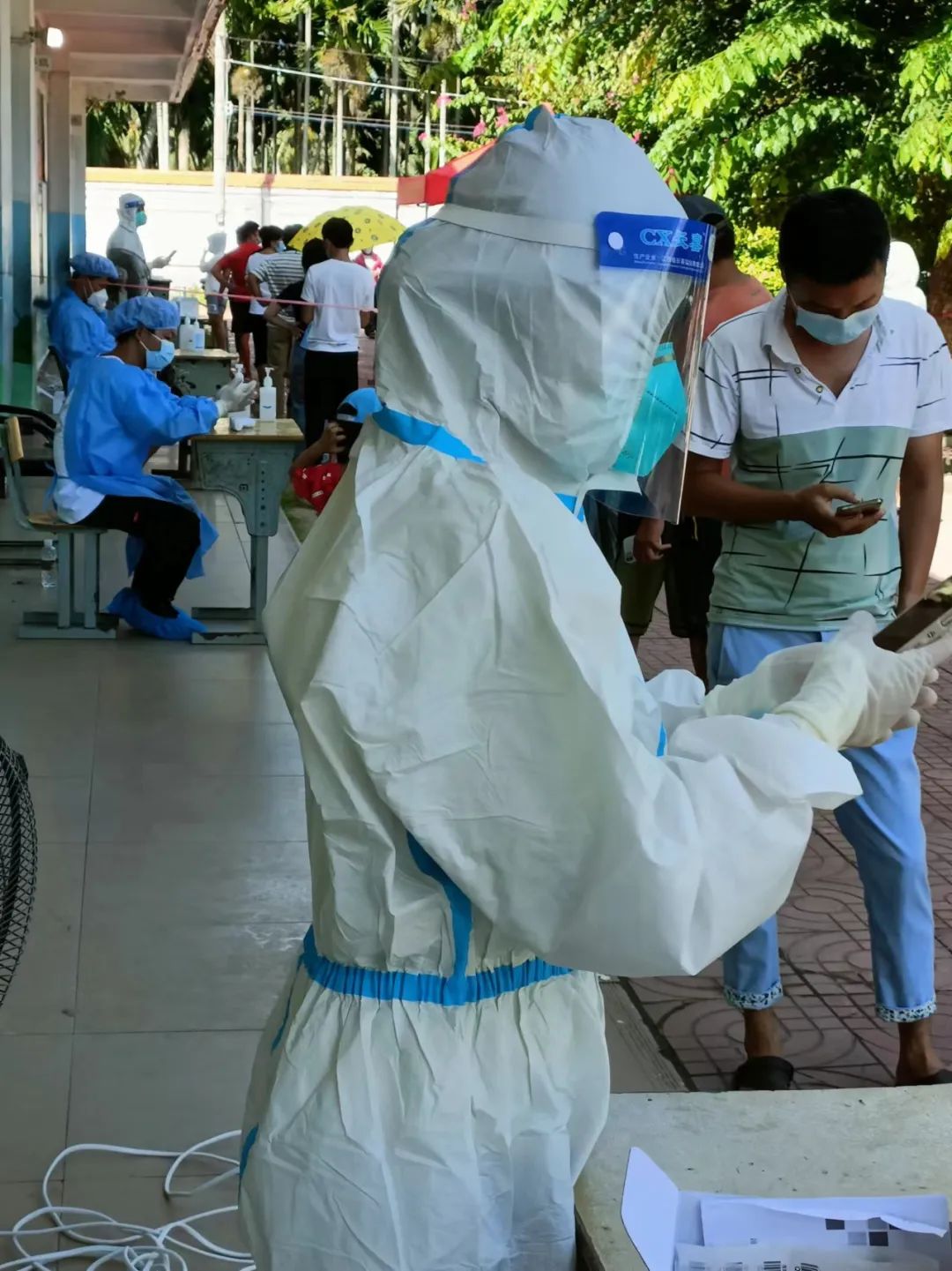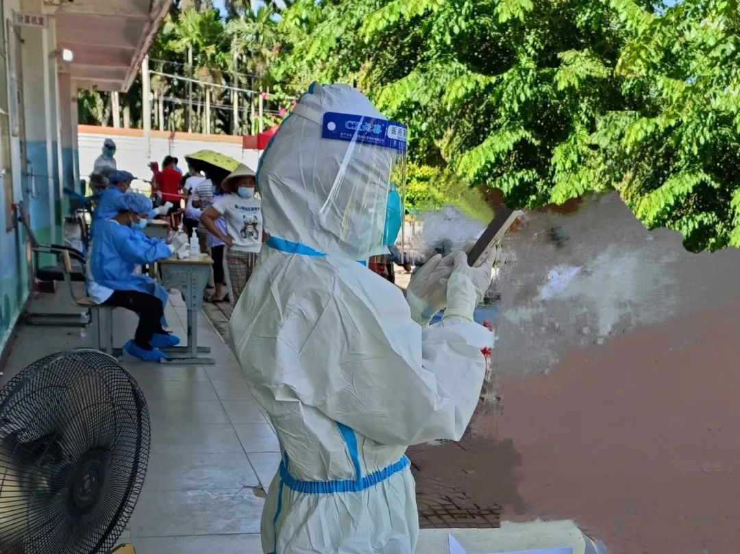 对新手的我而言,每一份工作都不容易,都十分艰难。让我印象特别深刻的就是:8月19日那天,我穿着厚重的防护服进行信息录入,那天人特别多,天气也特别炎热,我当时觉得我真的好累,我明显的感受到我的衣服已经被汗水浸湿了,我觉得我已经坚持不住了。但看着排队等待做核酸的村民,看着在采样的医护工作者,我当时觉得我要打起精神,继续给村民们进行信息录入。