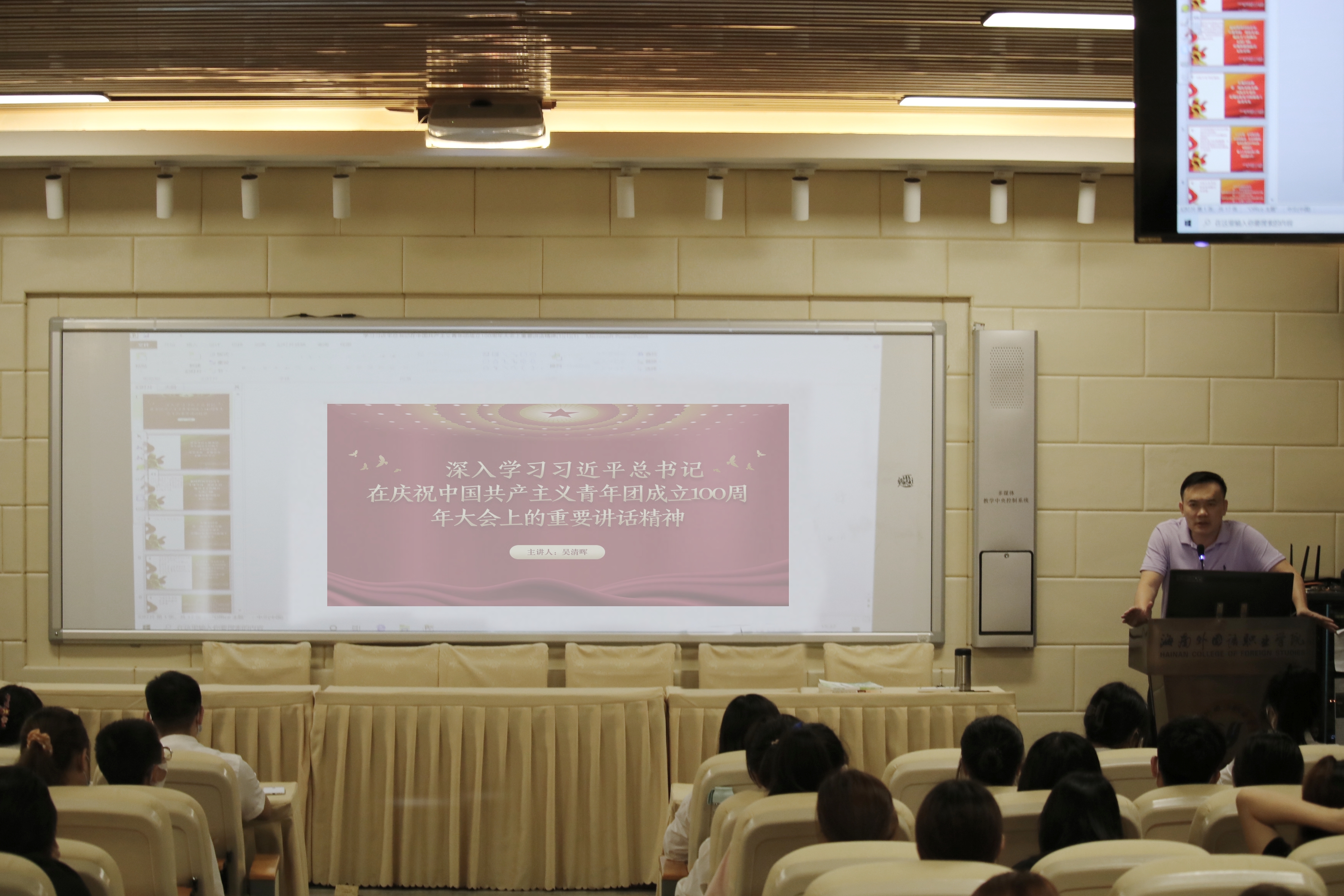 5月13日下午,英语系党总支副书记吴清晖在BE101 小型学术报告厅主题为《开展学习“习近平总书记在庆祝中国共产主义青年团成立100周年大会上重要讲话精神”》党课。英语系学生党员、入党积极分子、各班级团支书及学生会团总支各负责人参聆听了党课。