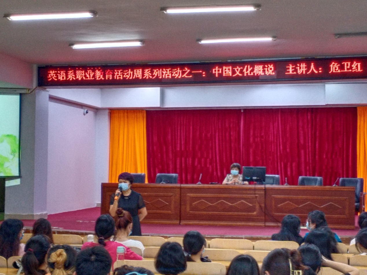 为了提高英语专业学生的文化素养,加深学生的文化底蕴,促进学生文化素质的全面发展,5月9号下午,英语系应用英语教研室在图书馆多功能报告厅举行了主题为《中国文化概说》的讲座。此次讲座是我系职业教育活动周的系列活动之一,也是我系开展“名师讲堂”的活动内容之一。我们特邀人文艺术系危卫红教授给20应英专业的学生上一节中国传统文化课。