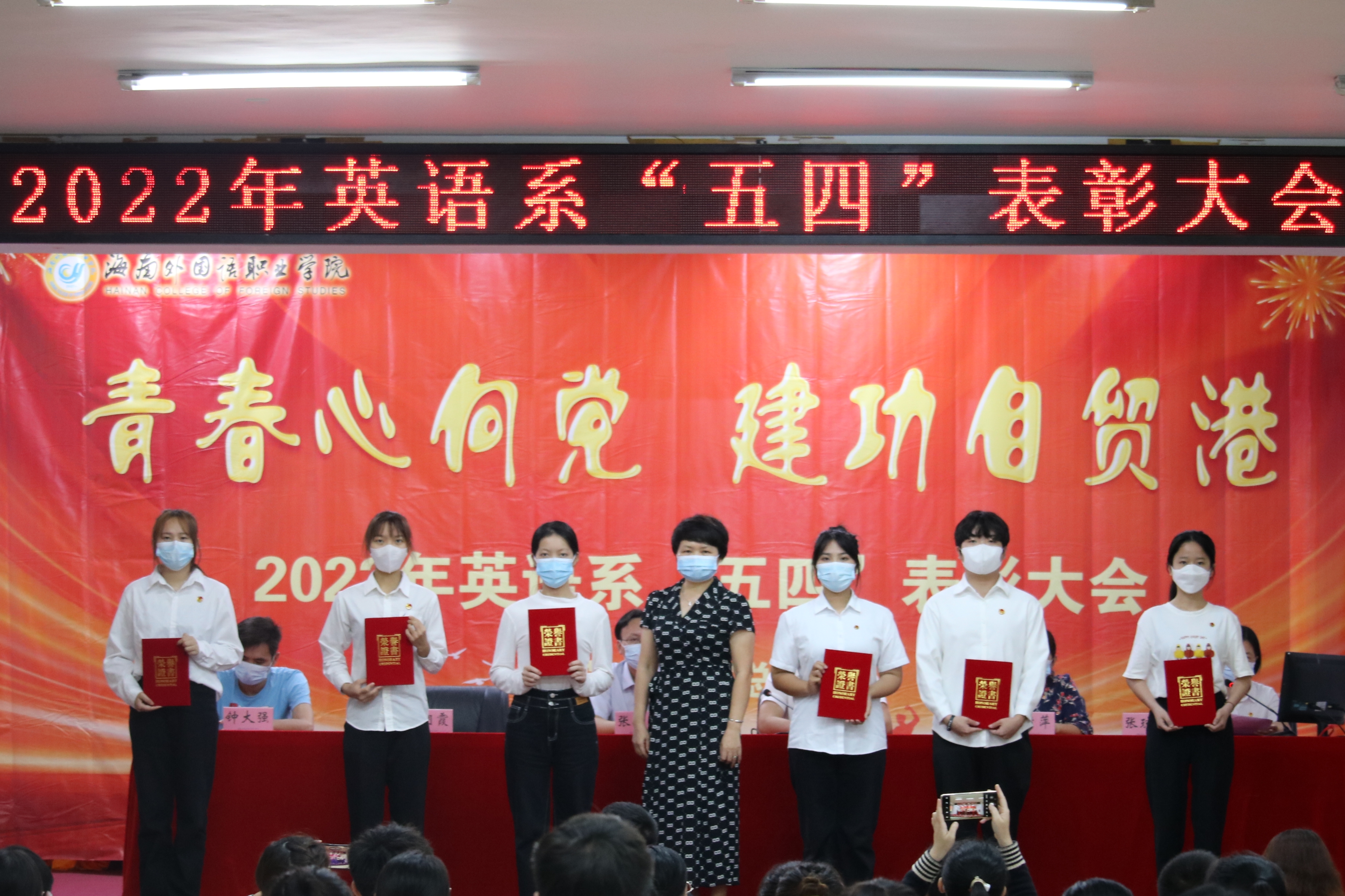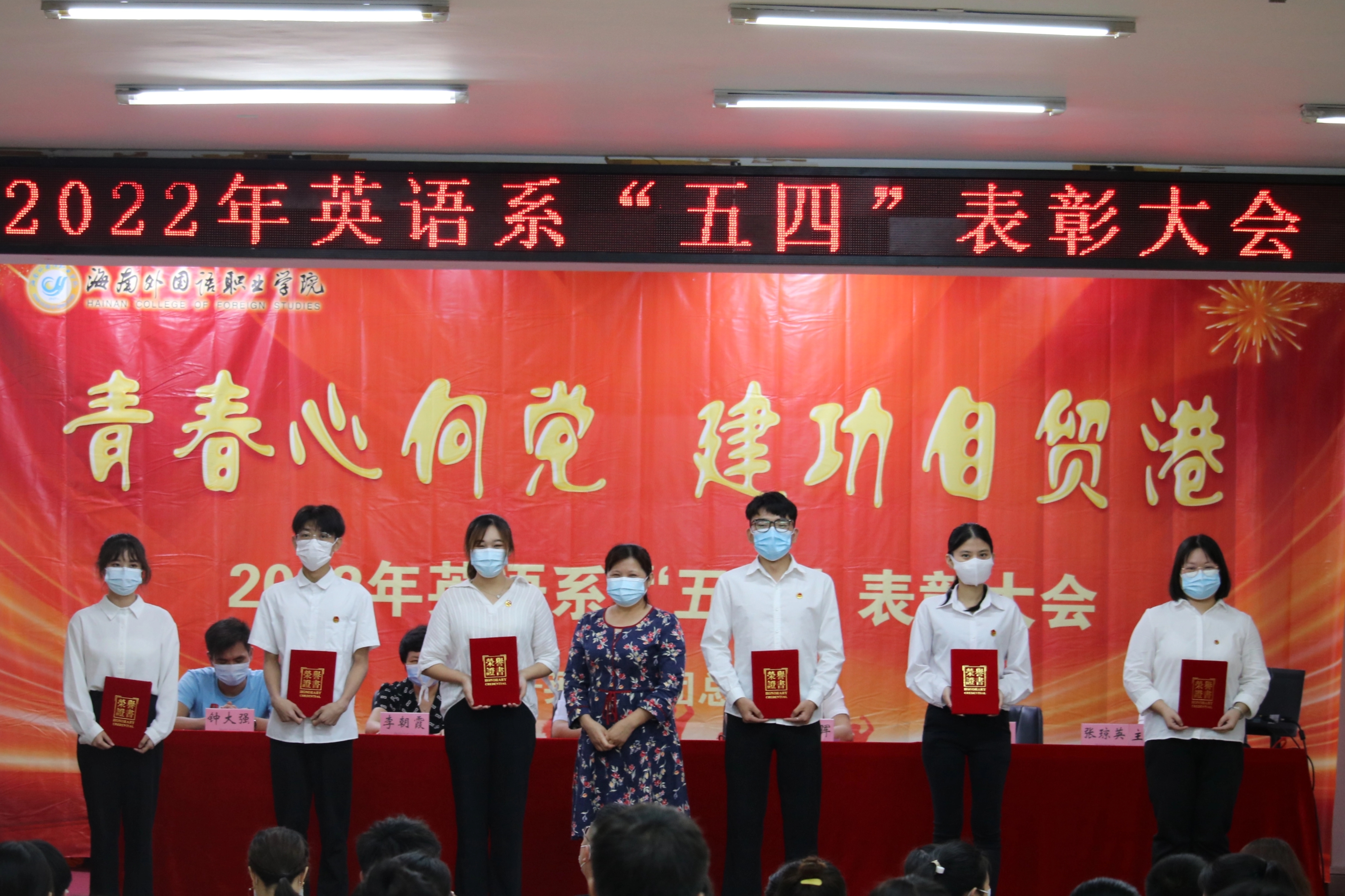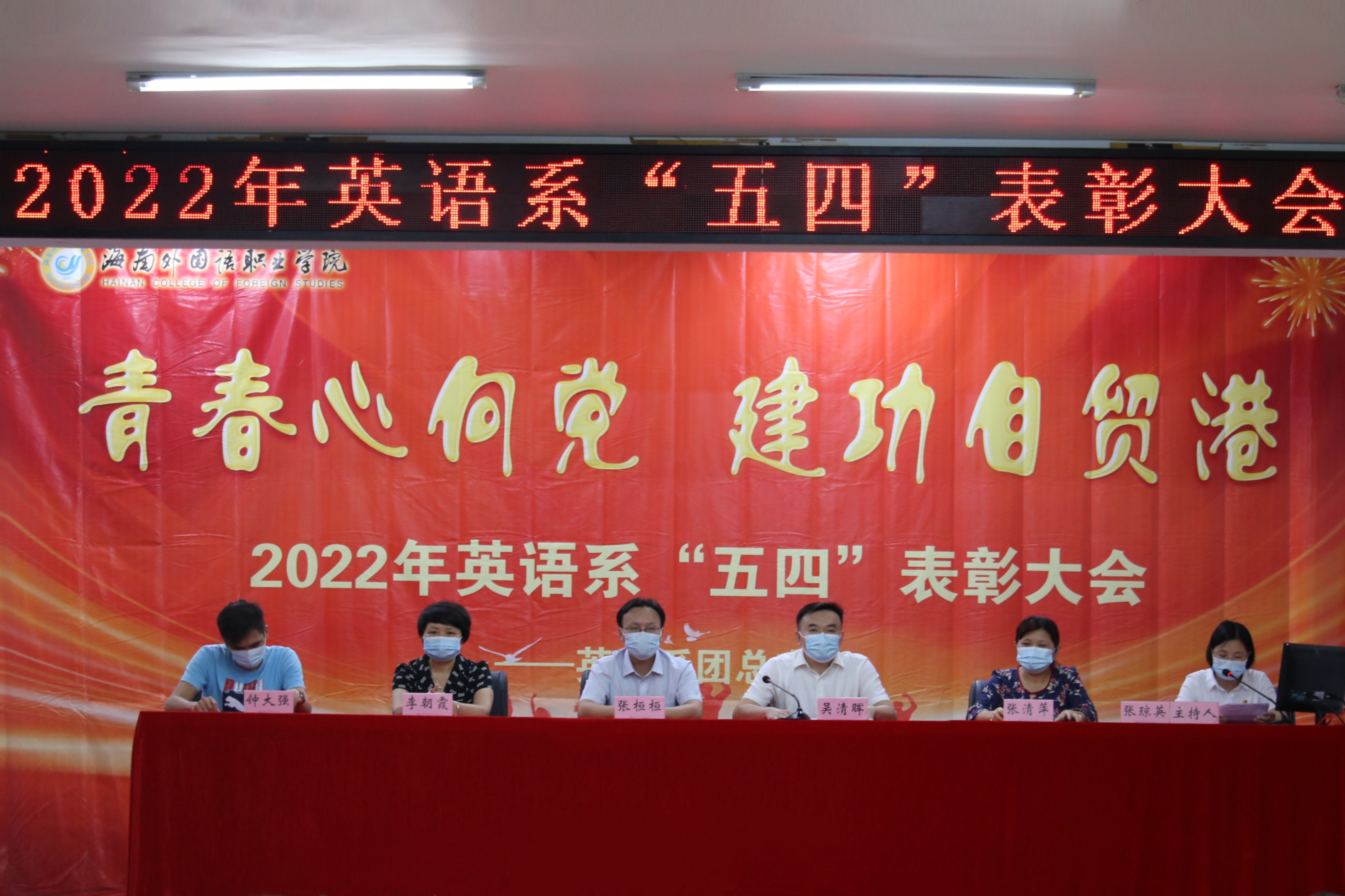 为认真学习贯彻习近平总书记系列重要讲话精神,深入开展党史学习教育,坚持“以党建带团建,以团建促党建”的工作思路,扎实推进我系共青团建设,落实从严治团要求,切实增强共青团员和广大青年的先进性和荣誉感。2022年5月6日晚8点,英语系在多功能报告厅隆重举行“青春心向党,建功自贸港”五四表彰大会。学院团委书记张桓桓、英语系党总支副书记吴清晖、英语系副主任张清萍、英语系副主任李朝霞、英语系学生科科长钟大强、英语系团总支书记张琼英、英语系教研室各主任、各班辅导员及此次受表彰的各位代表等130余人参加此次会议。