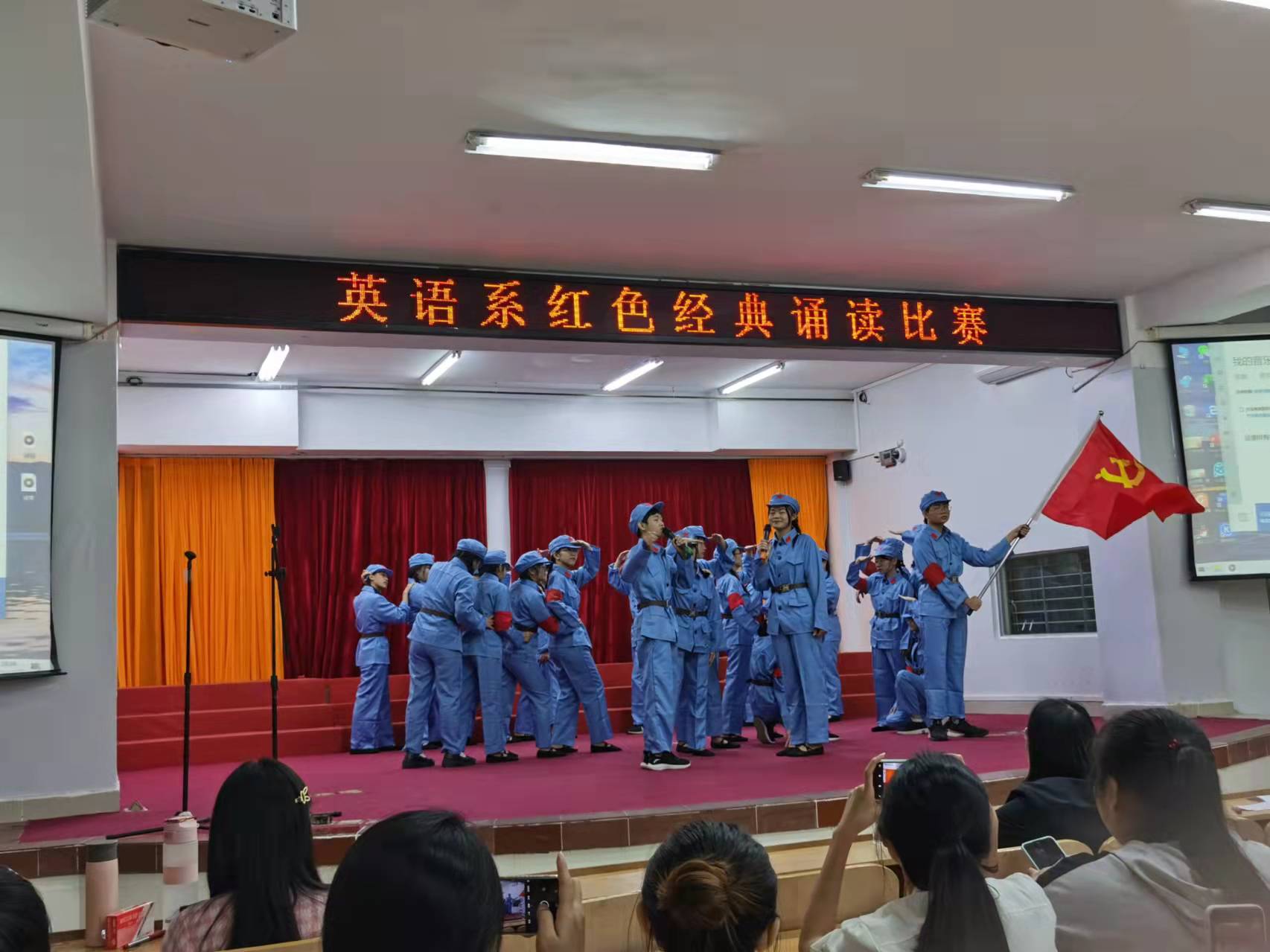 为培养学生的爱国热情,陶冶学生的艺术情操,增强集体凝聚力,激发我系青年学子的爱国热情,牢记当代大学生使命,弘扬时代精神,展现当代大学生风采,提升学生的诵读水平,展示青春活力,营造积极向上的校园文化氛围,英语系基础教研室11月20日晚上在多功能报告厅举行了五年一贯制2020级和2021级各班学生的红色经典诵读比赛。