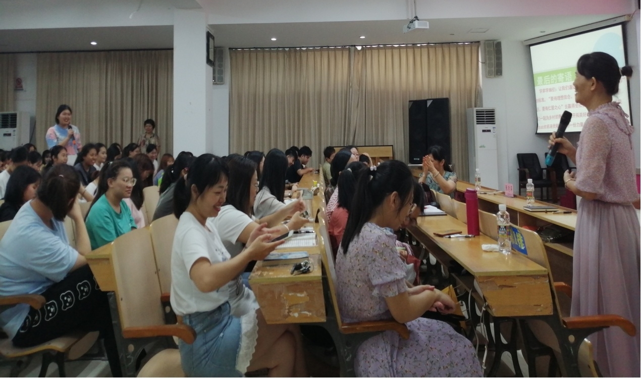 讲座中,李老师讲述了她自己在农村学校从教20多年来的故事,分享了她的教学成长、班级管理、学生德育教育故事以及用心从教的种种收获,还分享了海口市电视台对她的特别采访栏目。李老师的话语里充满了对乡村教师岗位的深情厚爱和浓厚的教育情怀,感动了在场的每位师生。