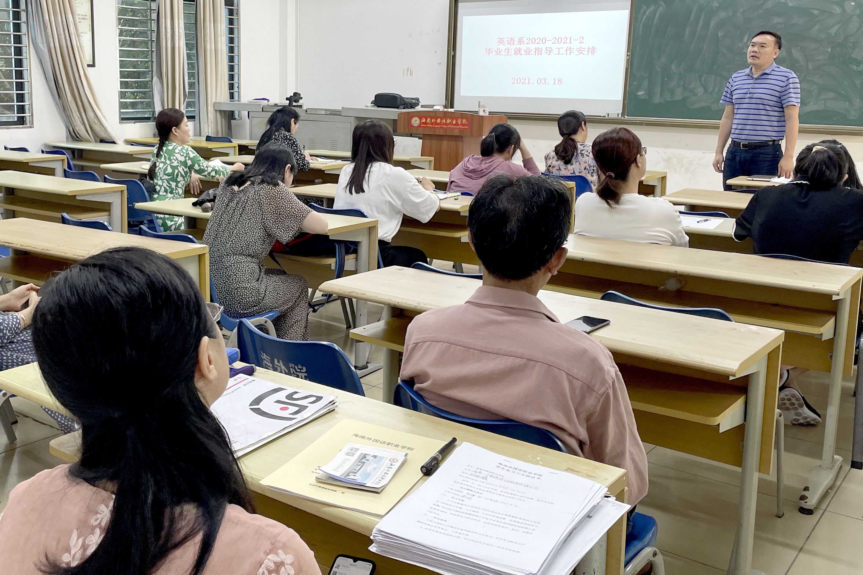 为全力抓好2021届毕业生就业工作,3月18日下午五点,英语系在AE202召开2021届毕业生就业指导会,对就业工作再强调、再部署、再推进。英语系党总支副书记吴清晖、副主任张清萍、毕业班辅导员和全体实习指导老师参加会议。会议由英语系就业指导员黄健主持。