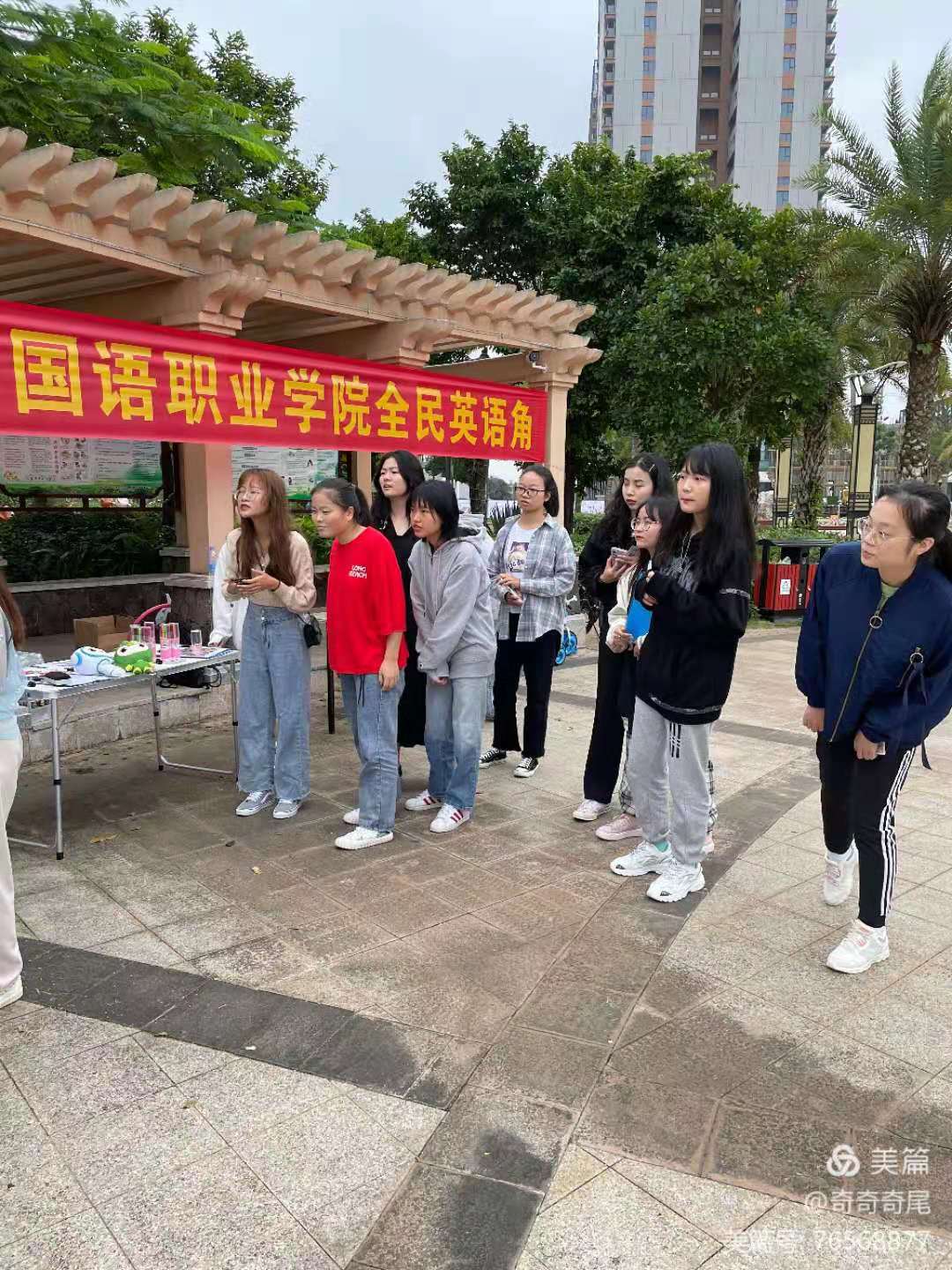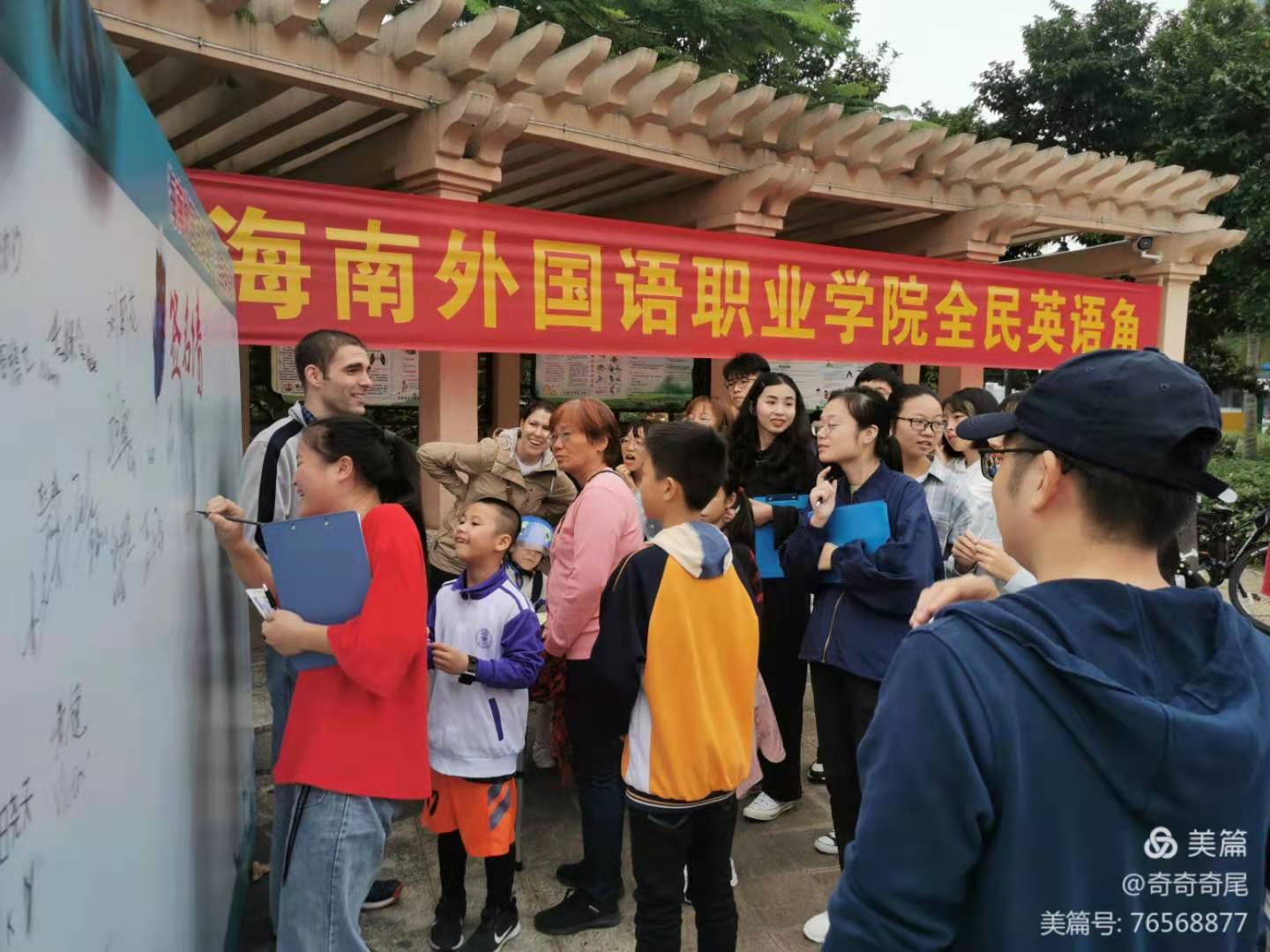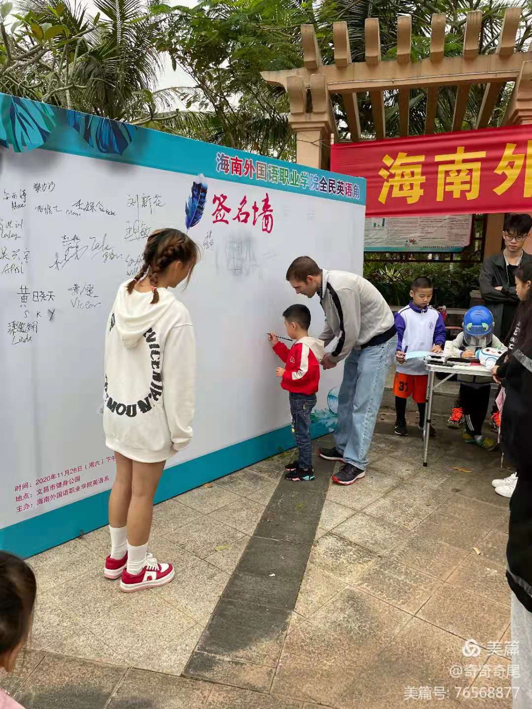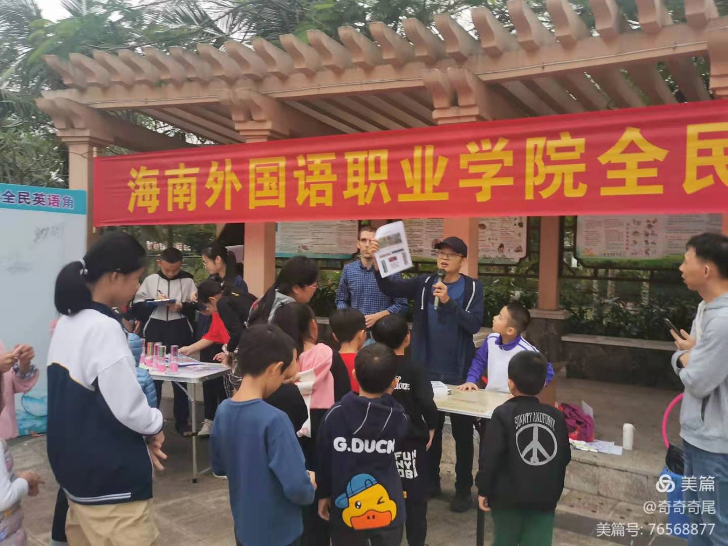 为响应海南省人民政府关于全面提升公民外语水平行动的号召,适应海南自贸区(港)建设需要,培养海南公民开放意识,提升公民外语文化素养和跨文化交际能力。我院于2020.11.29日周六下午,英语系黄健老师、美国外教John和Sarah带领着十五位文化交流协会的志愿者,在文昌市教育公园组织了一次全民英语角活动,希望借此活动进一步激发文昌市民群众学习英语的兴趣与积极性,提高市民群众语言交流水平,适应海南自由贸易港建设新形势,掀起全民学英语的热潮,形成全民投身海南自由贸易港建设的浓厚社会氛围。