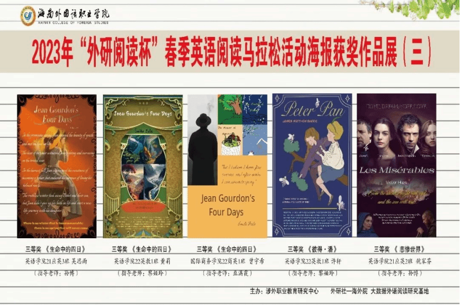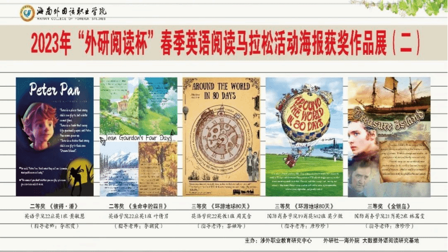 此次活动英语学院学生共提交了海报作品37份,书评作品54份。海报项目上,三位英语专业教师和两位视觉传达专业教师从主题、内容、设计、语言等因素对海报进行了综合评定。最终,21级应英2班韩宛彤的作品凭借主题突出、内容表达丰富、设计构图精美、语言表达准确等特点荣获一等奖。22级英教1班杨思敏、22级应英1班黄敏慧和叶倩男荣获二等奖;21级应英3班吴思雨、21级应英2班魏家芬、22级英教1班周笑含、黄莉和许轩荣获三等奖;谢慧雯等12位同学获得优秀奖。
