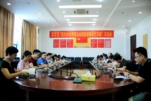 7月10日下午,英语系党总支在七楼第二会议室召开“我为加快推进海南自贸港建设作贡献”学习交流会。会议由英语系团总支书记冯琛主持,英语系全体党员参加会议。