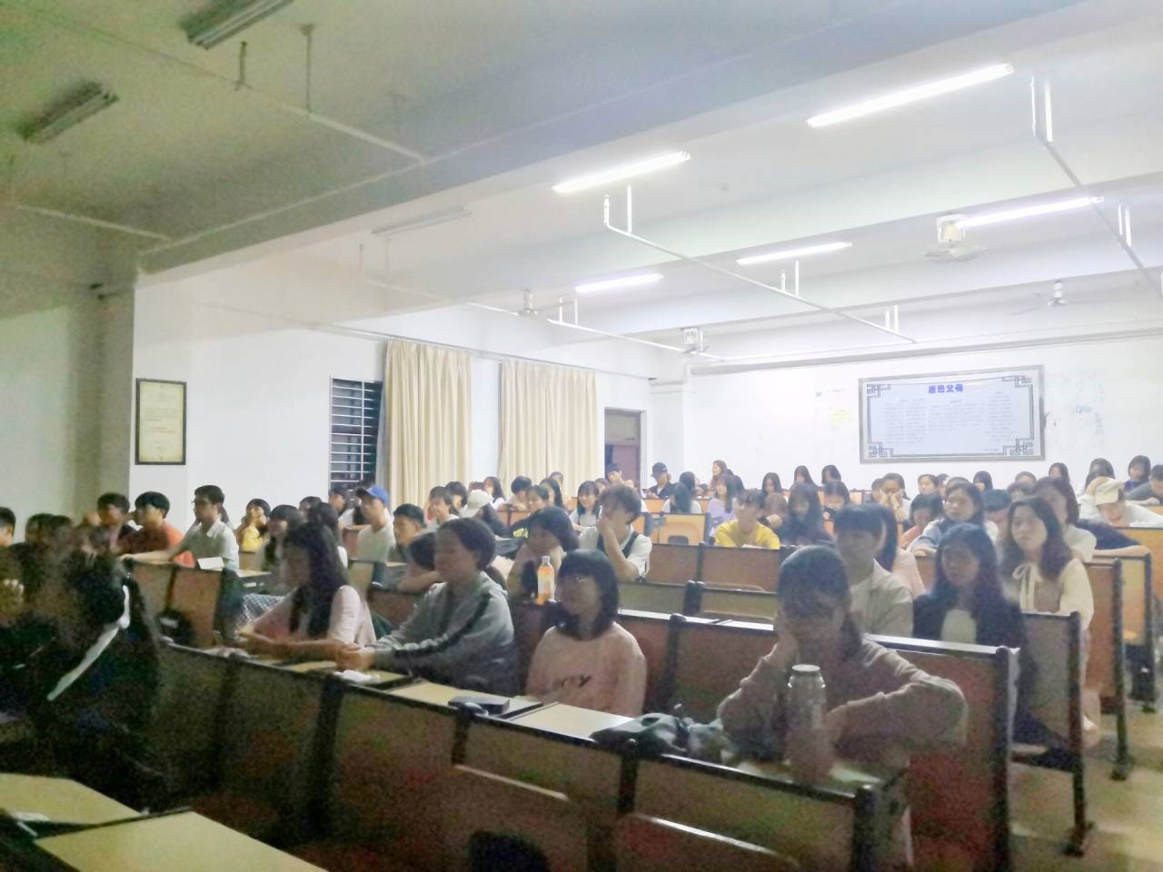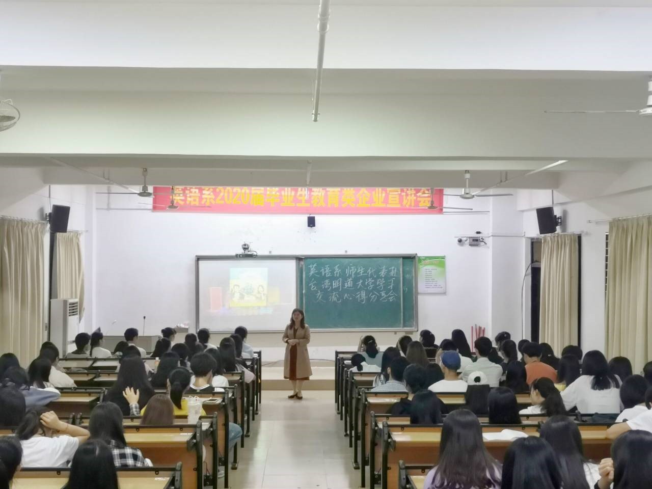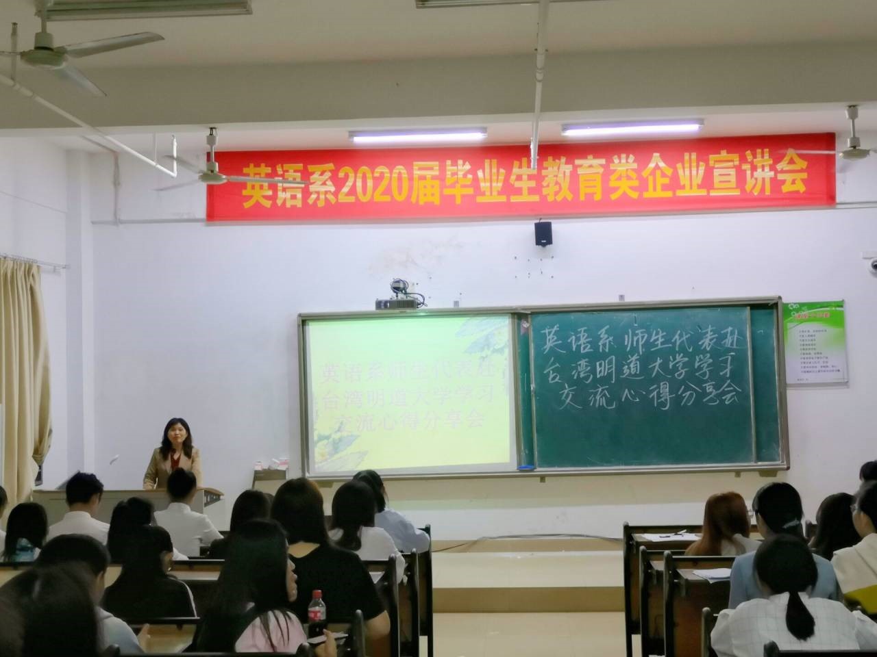 12月26日晚上,英语系师生代表团赴台湾明道大学交流分享会在综合楼AE102教室举行。会议由英语系副主任张清萍主持,全体非毕业班班长、副班长、学习委员及学生会干部共120多人参加本次交流会。