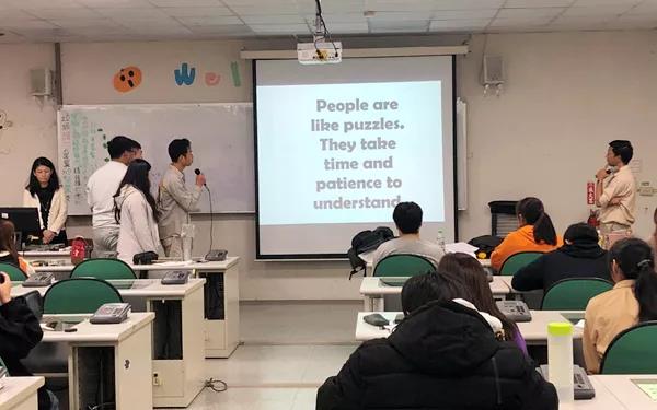 在接下来的三天里,双方代表一边排练英语话剧《Christmas Carol》,一边体验中教的《中英笔译》、《文法与句型》和外教的《声调节奏与口语练习》、《口语演讲指导》等课程的课堂教学。我院学生很快融入了大班课堂学习中,与台湾明道大学的同学充分互动、积极合作,尽情享受着课堂学习氛围,也充分展示了我院学子思维敏捷、活跃大方、敢于表达的精神风貌。
