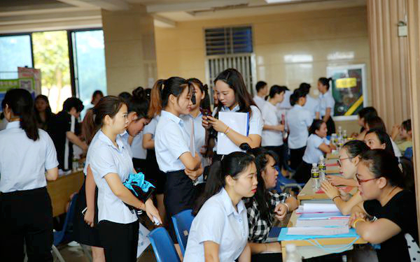 5月12日上午,我院英语系在综合楼一楼大厅举办2019届毕业生和2020届实习生招聘会。此次招聘会吸引了海口咕噜哈教育文化咨询有限公司、海南春田花花儿童教育有限公司、艺雅思幼儿园、海口星海湾豪生大酒店、三亚中心皇冠假日酒店等41家企业单位招贤纳才,招聘岗位主要有英语教师、幼师、早教老师,也有酒店接待员、服务员、礼宾员等多个领域400多个就业岗位,为我院学生提供了多方向的就业选择。