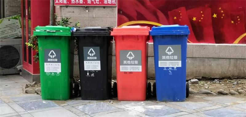 这里有一处摆放着分类齐全的垃圾桶,分别是“有害垃圾”、“其他垃圾”、“可回收垃圾”和“厨余垃圾”。