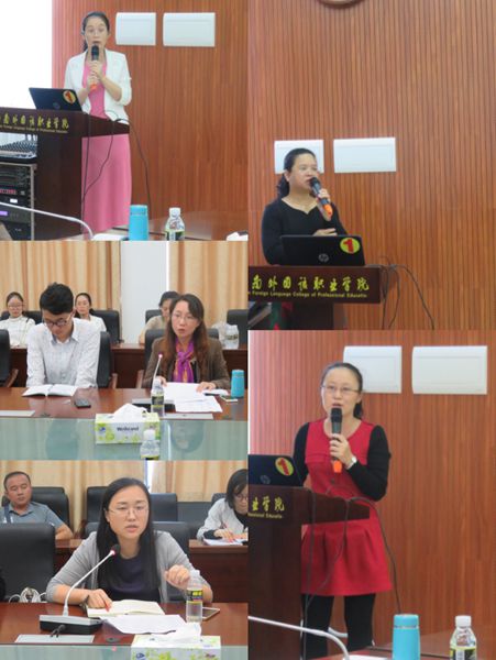 首先,各教研室主任轮流汇报总结本教研室活动进展的情况依次为基础(一)教研室郑一新主任、基础(二)教研室陈春妮主任、翻译教研室翁天月主任、涉外事务教研室陈雁主任、少儿师资教研室金龙英主任。汇报过程中,一项项让大家印象深刻的活动被以PPT形式展示在大家面前,包括英语故事演讲比赛、英语情景描述比赛、英语辩论赛、模拟面试、礼仪操展示及英语趣配音等等。