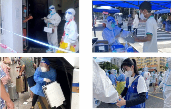 投身疫情防控,彰显青春担当。在海南“0801”疫情期间,英语学院多名师生志愿者在疫情最紧张的时刻挺身而出,义无反顾地加入到防疫队伍中。蒋睿、林圆圆等同学也主动申请加入当地疫情防控小组,为家乡疫情防控贡献自己的一份力量。八月的海南,连日的高温,密闭的防护服,变化莫测的疫情,她们战斗在核酸采样、测量体温、信息登记、环境消杀、人员转运等疫情防控一线岗位上。即使满头大汗、两眼发昏,即使工作时间长、工作强度高,她们服从安排,毫不退缩,用坚强的意志、顽强的毅力克服一切难题,争当最美“逆行者”。为群众送上温暖和关怀,用责任与担当筑起一条闪亮的青春防线。