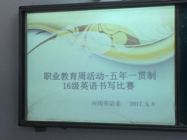 为了进一步推动职业教育的改革与发展,引导全体毕业学生认识职业教育,转变成才观念,海南外国语学院于2017年5月2日-12日,开展“职业教育活动周”活动暨东盟语言与文化系列论坛报道,以下是应用英语系五年一贯制16级学生的英语书写比赛,参加比赛的学生五年一贯制16级的学生,他们正在认真的书写。
