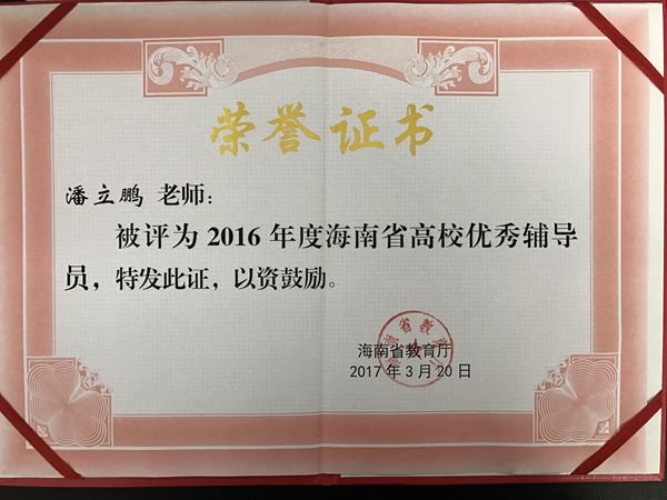 近日,经海南省教育厅评审,我系辅导员潘立鹏老师获得2016年度“海南省高校优秀辅导员”荣誉称号。