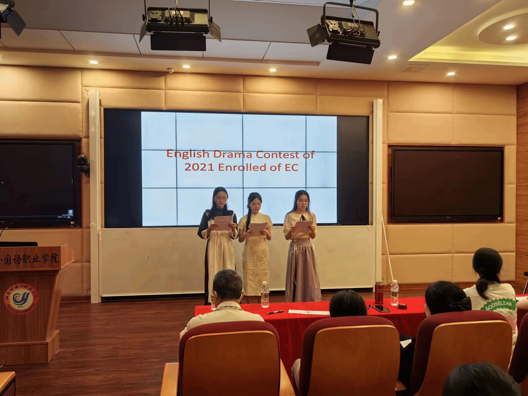 在比赛中各组都展现了自己的风采,尤其是第六组表演的剧目《甄嬛传》最令人印象深刻,不管是讲英语台词的流利度还是表演都非常精彩!有了道具的加持和人物之间的相互配合,该节目显得更加出色。陈家建老师为此次活动进行了点评,他说,今天大家表现非常棒,通过精彩的台词表现和表演以及精致的道具和场景设置,展现了话剧艺术的魅力,每组各具特色,人物设定形象突出,相信我们中某些同学将来一定能成为好演员!最终同学们也获得了令自己满意的成绩。