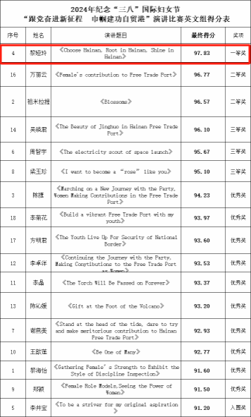 在英文组的角逐中,黎娅玲老师用流利的英语表达自己的观点,展现了建设海南自贸港的新时代女性风采,最终以第一名的好成绩获得英文组一等奖!