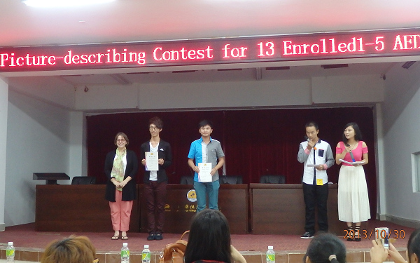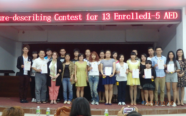 为了提高学生的英语口语表达和运用能力,丰富学生的学习生活,为他们提供展现自我和互相交流的平台,应用英语系于2013年10月30日晚上7:30分在多功能报告厅举行高职13应英(1-5)班英语情景描述比赛,比赛吸引了该年级全体学生前往观看。