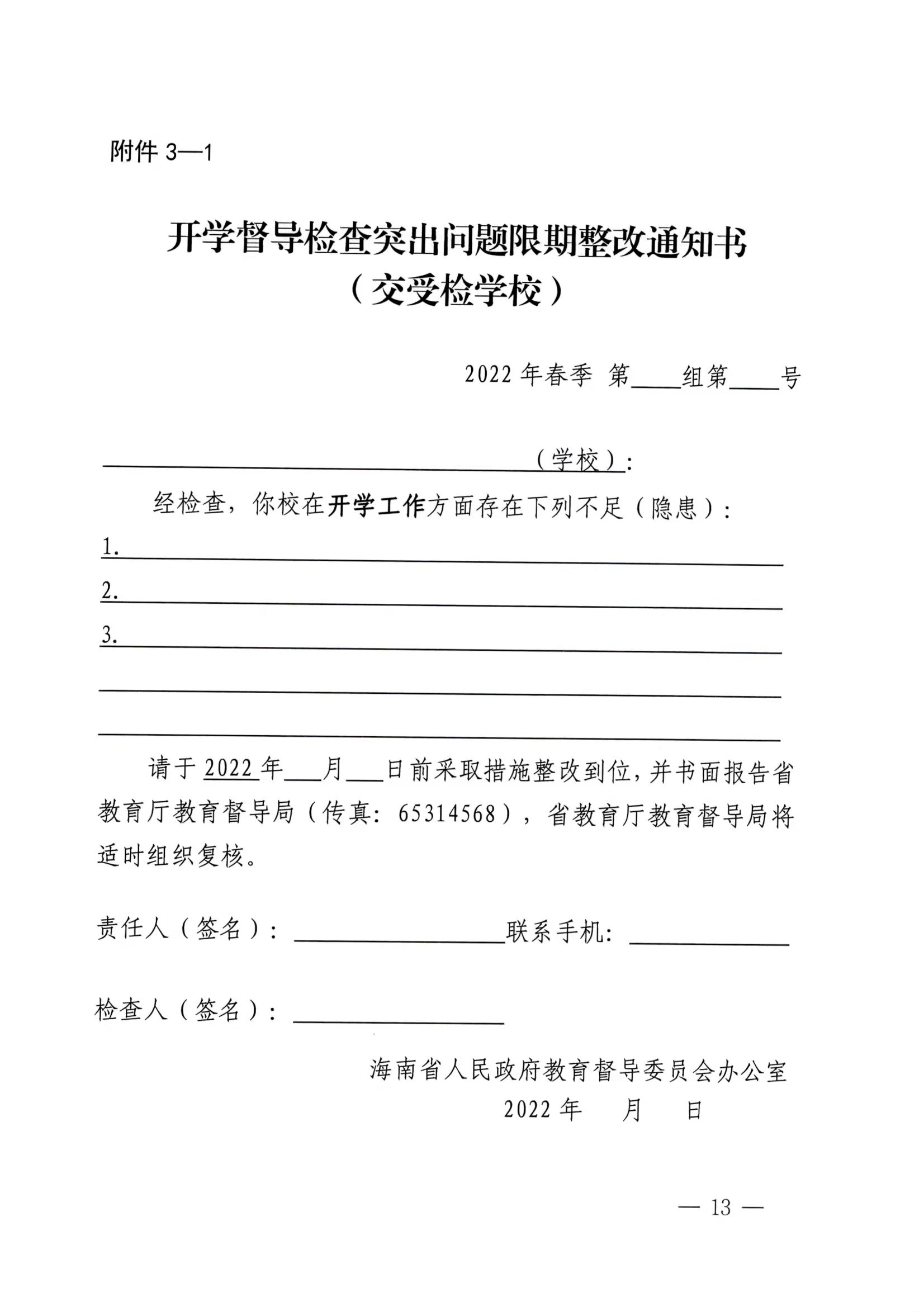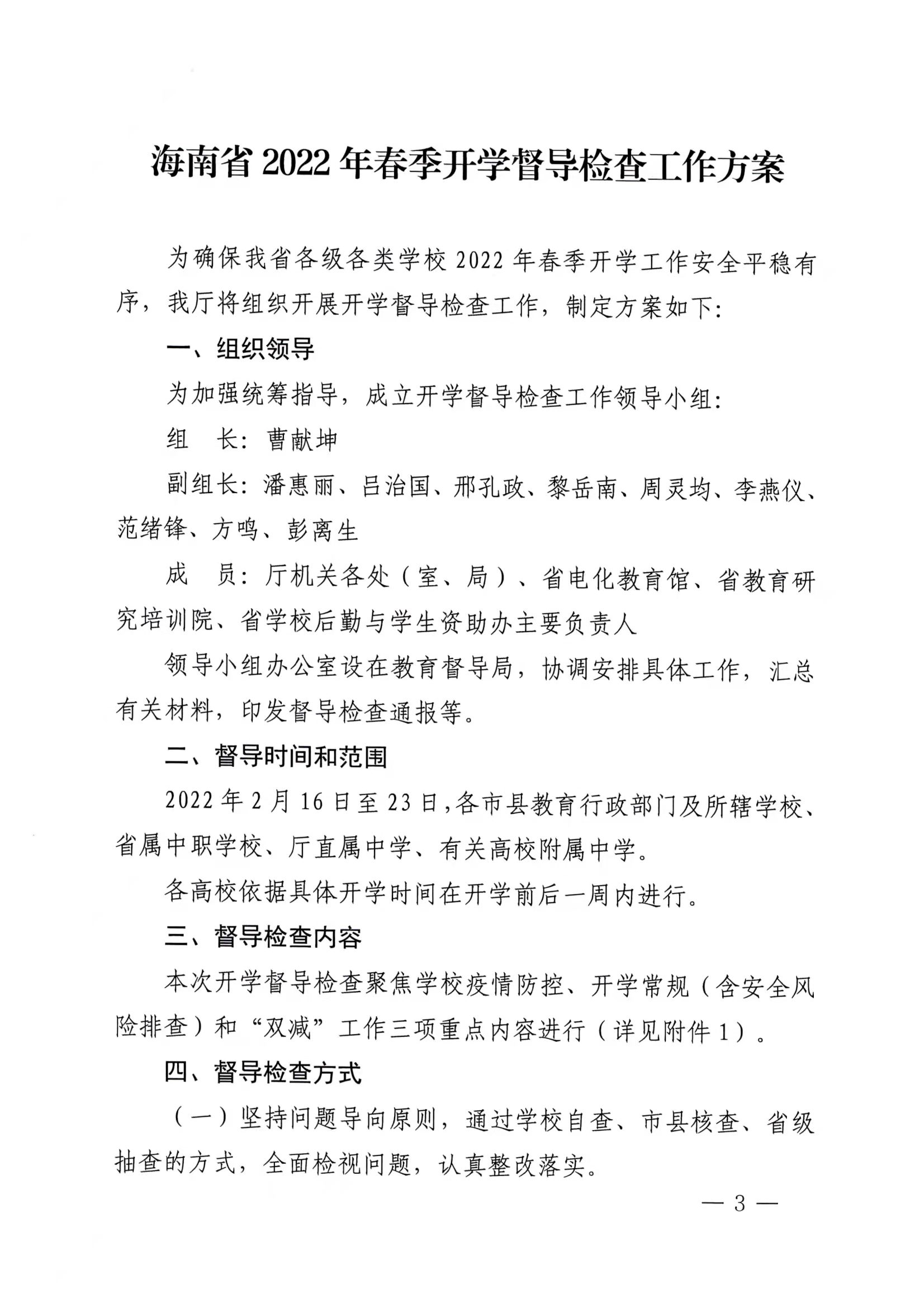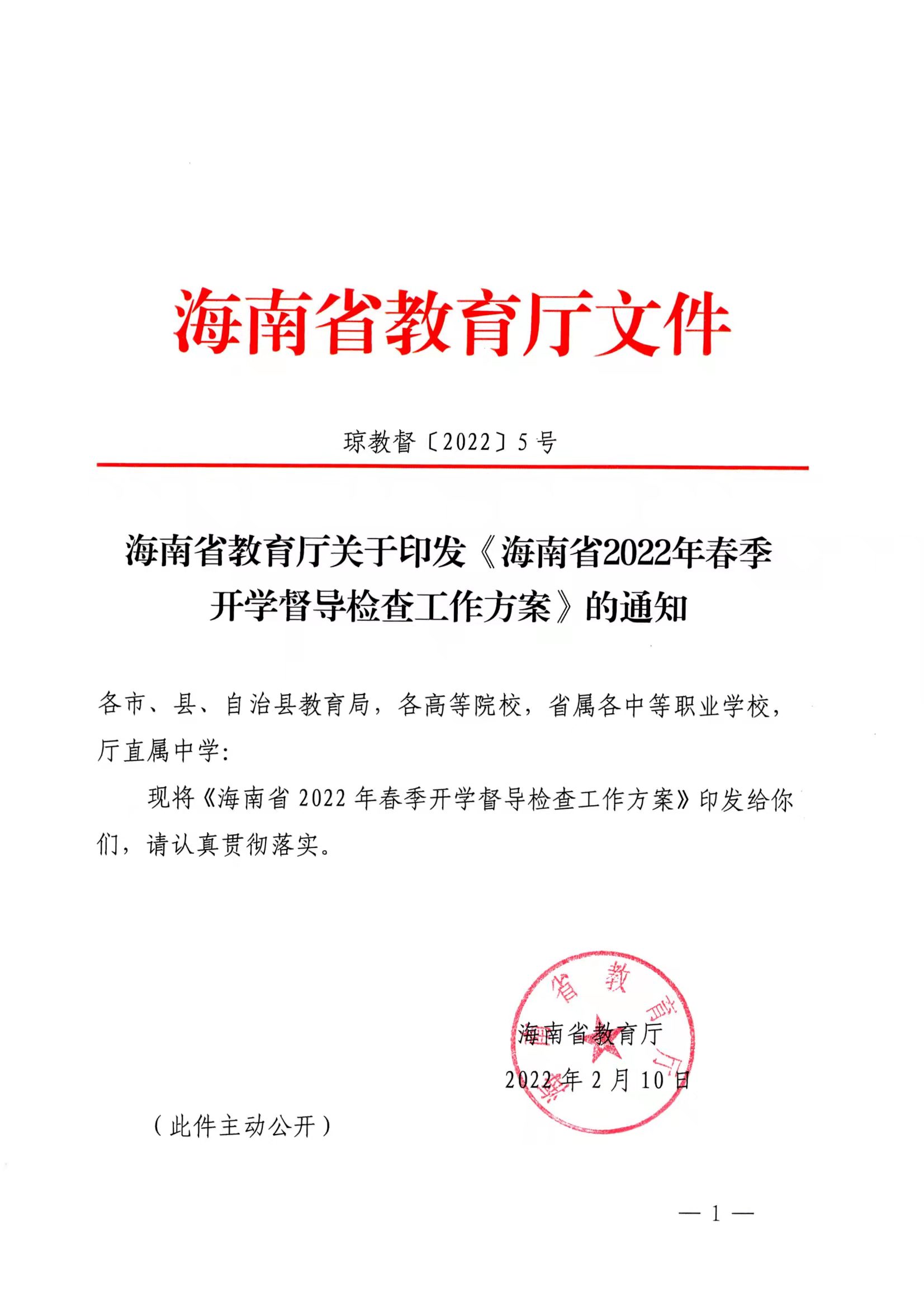 海南省教育厅关于印发《海南省2022年春季开学督导检查工作方案》的通知